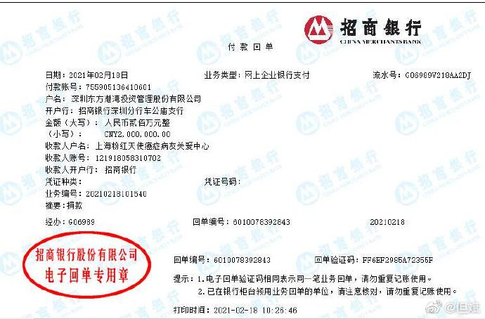 2月18日,新春伊始,东方港湾董事长但斌微博中表示,分别向上海粉红天使癌症病友关爱中心捐献200万;向云南青少年发展基金会捐献200万;向爱佑慈善基金会捐献100万!也向他(她)们的爱心和慈善事业致敬。截止发稿时间,该微博有111条转发、147条评论,收到1606赞。