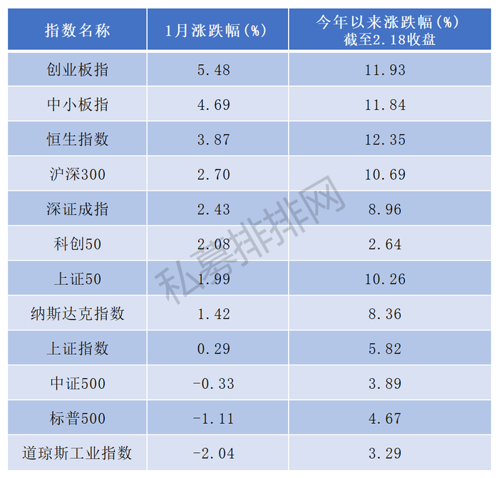 在2021年的首个交易月,A股虽然开年首日迎来开门红,但是全月来看,先涨后跌依旧为区间震荡。从指数表现来看,创业板指累计上涨5.48%领先,中小板指涨幅4.69%,沪深300指数累计上涨2.70%,上证指数累计上涨0.29%。大批南下资金涌入港股,使得港股核心资产表现略胜一筹,恒生指数1月大涨3.87%。