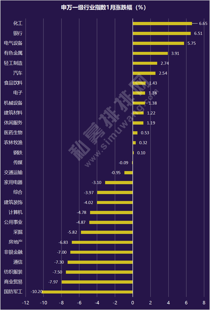 虽然指数均为上扬,但是个股表现并不出彩,在结构性行情下,A股多数个股依旧处于下跌通道,1月份两市个股涨幅中位数为-8.39%,更有3215只个股收跌,1796只个股跌幅超10%。锂电池、光伏、白酒等题材股持续活跃,受到政策面影响,稀土、可降解塑料也受到资金的追捧。细分到申万一级行业表现,化工、银行、电气设备、有色金属涨幅居前,纺织服装、国防军工、非银金融、通信则跌幅居前。