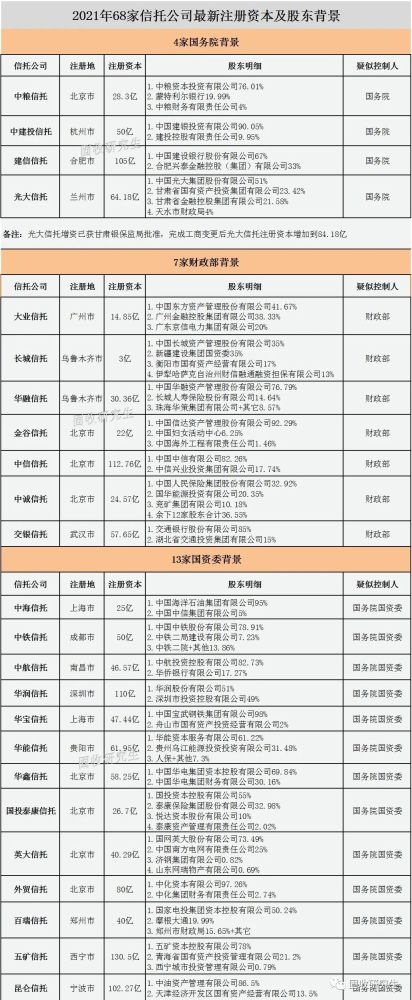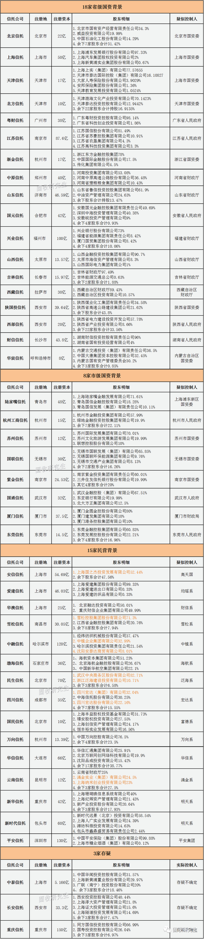 目前全牌照金控平台旗下信托公司(中信集团-中信信托、光大集团-光大信托、平安集团-平安信托),四大AMC旗下信托公司(华融信托资产-华融信托、中国长城资产-长城信托、信达资产管理资产-金谷信托、中国东方资产-大业信托),银行系信托公司(中国建设银行-建信信托、交通银行-交银信托、浦发银行-上海信托、兴业银行-兴业信托),A股上市信托公司(安信信托、陕国投信托(000563)),港股上市信托公司(山东信托(1697.HK))。
