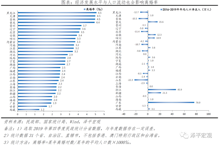 四是经济发展水平与人口流动也会影响离婚率,往往经济发展较弱、人口流出严重的地区,离婚率相对较高。夫妻长期两地分居动摇感情基础,是导致离婚的重要原因。黑龙江、吉林、辽宁离婚率分别为4.5‰、4.5‰、3.6‰。