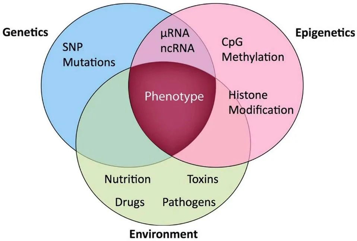 这张图试图说明基因、表观遗传和环境三者间是有互动关系的。可以看出,一个人的各种组织的表型是由一组基因来定义的,即它是各种基因表达的总和。但基因表达取决于各种表观遗传因素(如CpG位点的甲基化和组蛋白的修饰),同时又受到环境因素(例如营养、毒素、病原体和药物等)的修饰。经验不仅在本代改变表观,而且会通过DNA甲基化作用等影响基因,影响代际遗传。你的基因库(本能、先验结构)无非就是几十亿年此种互动机制的结果。