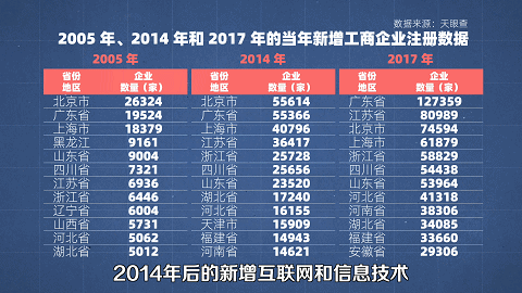 以 2005 年、2014 年和 2017 年的当年新增工商企业注册数据来看,2014年后的新增互联网和信息技术以及相关服务企业基本集中在南方。言之,技术含量较高的企业大部分都跑去了南方。