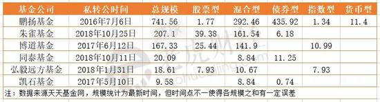 而从6家“私转公”公司来看,角色转换带来的“成绩”也是差异悬殊。据天天基金网最新数据,除鹏扬、博道、朱雀3家在管基金规模超百亿外,另外3家机构的管理规模均不大。其中弘毅远方发行基金数最少,仅7只。而凯石作为第二家私转公的基金公司,目前规模仅9.58亿,排名垫底。