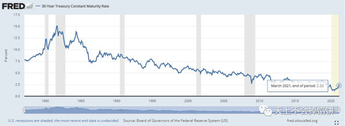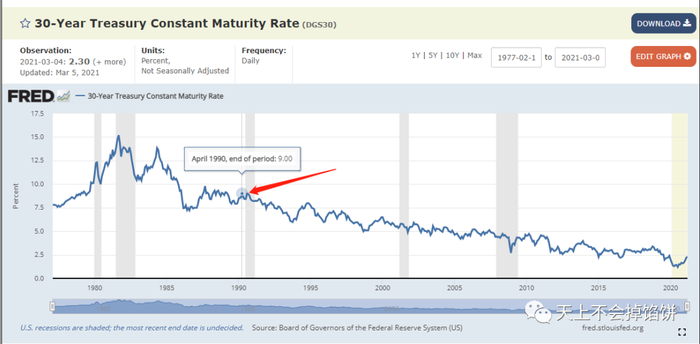 我们看到Q值从底部一路不回头是从上世纪90年代开始的,我们来看30年期国债利率期间的走势: