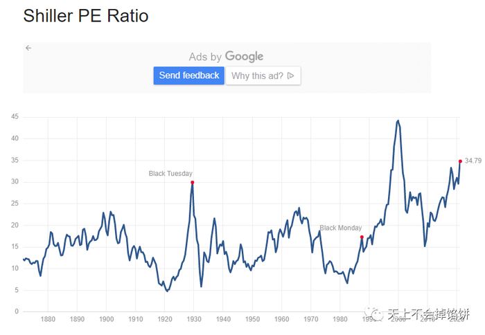 2000年 .com bubble 因为有大量的根本毫无盈利的企业估值炒老高,所以导致 Earing 值太小,比值飙到很高,就有实真的问题。上面这个指数叫 Shiller CAPE Ratio 是调整过通胀和财务计算方式的改良版市盈率。目前的值是 34.79,是除了2000年实真数据外最高的,高于1929年大萧条最颠狂的时期,也远高于次贷危机前最高值(均在30倍左右)。