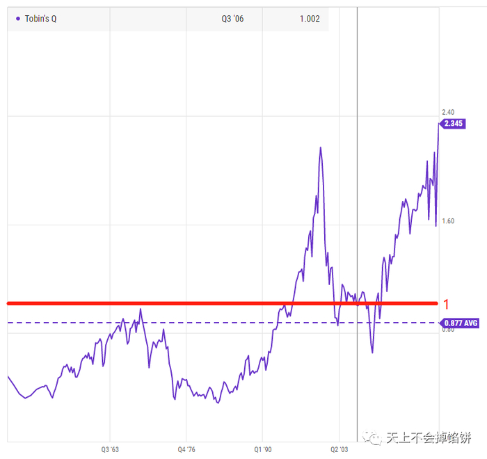 这图的时间跨度比较大,从1945年开始到现在,蓝色的虚线是均值。最近一次跌穿均值在2008年三季度,是次贷危机后续的情况,后面大半年托宾Q值最低到过0.653。