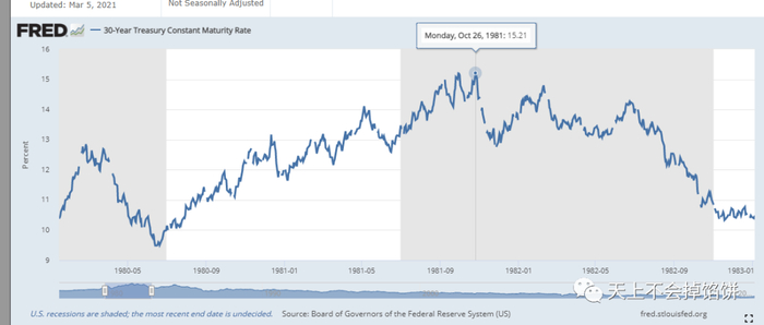 随后利率迅速向下,又低于同期的股市回报率,股票企稳,但好景不长,随后的利率一路飙升,攀升到了最高的时候是1981年10月底,高达15.21%