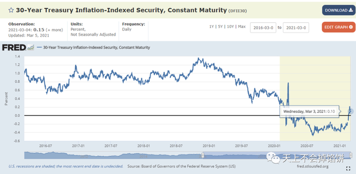 要注意的是这里的指数是通胀预期,也就是市场交易 TIP 国债和普通国债的价差产生的通胀预期数据,不是真实的通胀率。