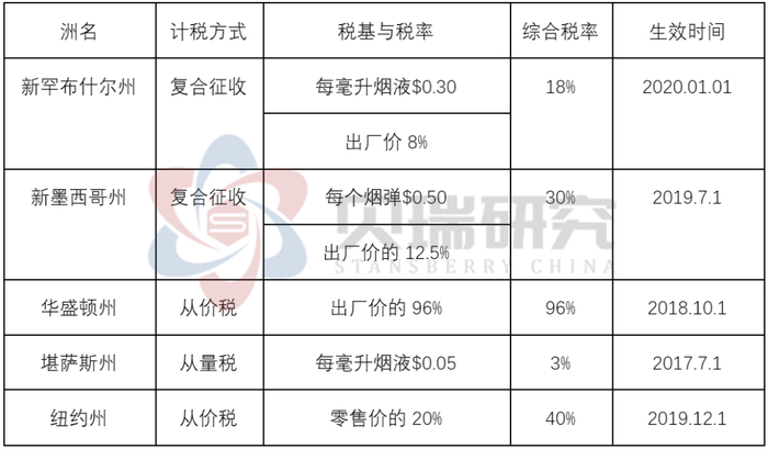 我们先看下美国的情况,美国目前已有20个州征收烟草的专门税,但各州计税方式与税率差异较大,从价、从量或复合征收的都有,有综合税率只有3%的,也有高达96%的。
