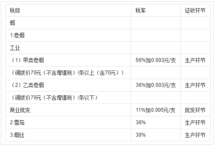 烟叶在收购环节有一道烟叶税20%,之后烟丝生产收一道30%,卷烟生产环节是从量与从价复合征收,分别按支(每条烟0.6元)和按价收36%-56%,最后首次流通环节还有一道复合税。