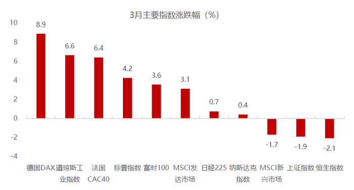 国内方面,A股与港股跟随全球股市先跌后涨,但整体偏弱。月初随着美债利率持续走高,高估值的基金报团股持续回调。下半月,海外不确定性开始增加,美债利率上行放缓,A股与港股随全球股市反弹。然而,受制于中美关系恶化、某家族基金爆仓以及中概股面临SEC审查等因素,其反弹力度欠佳,3月上证指数下跌1.9%,恒生指数下跌2.1%,全球主要股指中表现最弱。