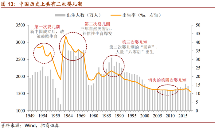 中国的第三次婴儿潮属于自然灾害后婴儿潮的“回声”。1986-1990年的5年间出生大量人口(尽管这时已经开始执行生育控制政策),其中,1987年的出生人口达到高点2550万人,之后持续降低。按照当代人的婚育年龄计算,这部分“八零后”出生24-30年后,即2010年前后,中国将自然而然地迎来第四次婴儿潮。