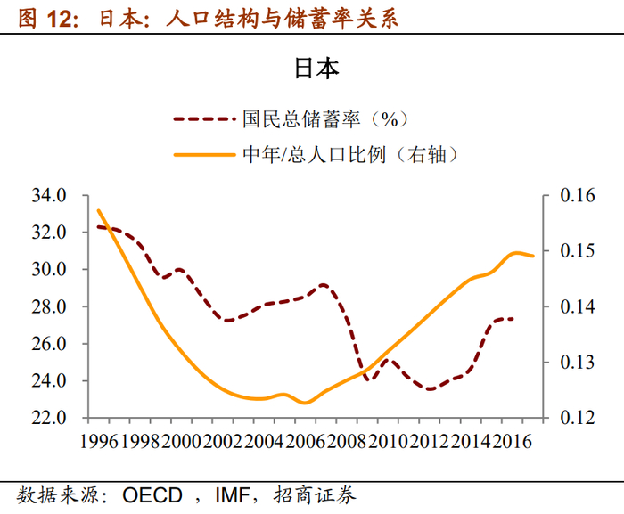 中年人口对资金供给的贡献部分反映在储蓄率方面,尤其是亚洲国家。1982-1990年,中国的中年人口比重稳定在9%,国民总储蓄率在35%附近波动;1990-2010年,中年人口比重快速上升至16%的同时,储蓄率快速上升至50%,中年人口为经济社会发展提供了较多的资金支持;2010年以后,中年人口比重趋于回落,储蓄率也开始下降。日本在2010年之后的情况与中国相反,尽管日本老龄化趋势未有好转,中年人口崛起带动储蓄率回升。
