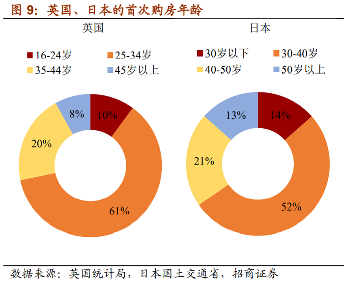 一个直接证据体现在房地产领域。个人对于房地产的需求贯穿整个生命周期,其中,首次置业需求是最为核心的需求。从国际经验来看,青年人口是首次购房的主力军。1985年以前,美国的平均首次购房年龄在30岁以下,目前为31岁;1995年以前,英国的平均首次购房年龄也在30岁以下,目前为33岁;日本的首次购房年龄在世界范围内偏大,40岁以下占比也达到约65%。与这些国家相比,中国的首次购房年龄尚处于相对“年轻”阶段,链家数据显示北京与深圳的首次购房年龄分别为33岁、31岁。考虑到一线城市的购房压力大于全国,因此全国的平均首次购房年龄应该小于30岁。