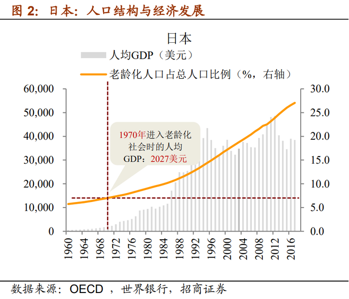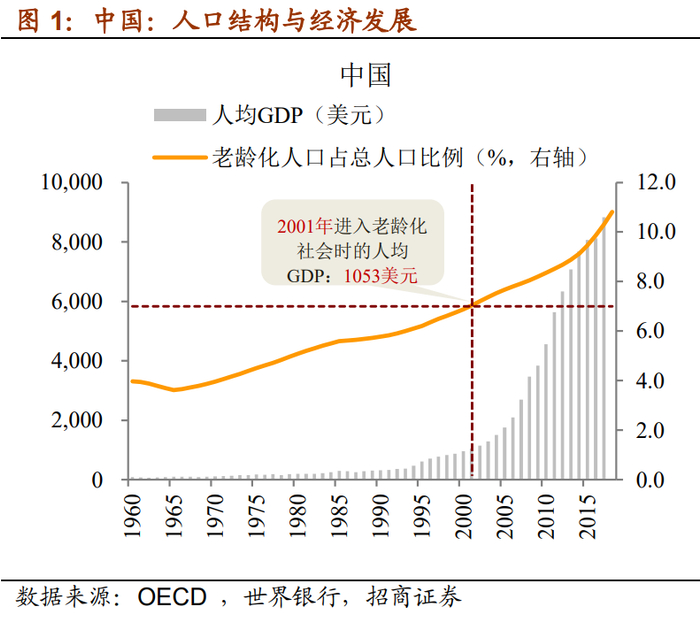 中国人口结构变化“超前”于经济发展。按照世界银行数据,日本于1970年进入老龄化社会,当时日本人均GDP达到2027美元,呈现“先富后老”特点;而中国于2001年进入老龄化社会时,人均GDP仅为1053美元,呈现“未富先老”特点。