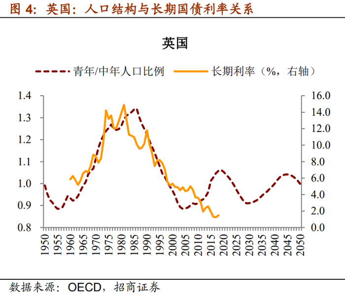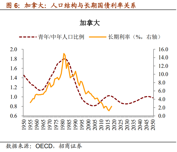 以美国、英国、法国、加拿大为例,这些国家在二战后迎来“婴儿潮”。在这次战后婴儿潮中,有大量人口出生,对全球经济产生了深远影响。据统计,美国在1946-1964年间出生的人口达到七千余万人,约占美国目前总人口的三分之一。这部分人口在 1960年之后陆续步入青年,青年人口相对于中年人口增多,推动青年/中年比例上升,利率随之上行;1980年前后,青年/中年比例达到顶峰,各国利率的历史高点普遍出现;1980年之后,这部分人口又陆续步入中年,中年人口相对于青年人口增多,推动青年/中年比例下降,利率开始回落。