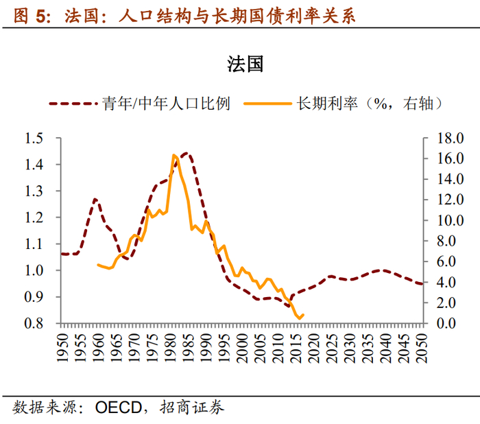 结果发现,OECD国家的青年/中年人口比例与利率之间普遍具有正相关关系。青年/中年人口比例不仅与利率走势基本一致,而且很好地匹配利率的长周期拐点。