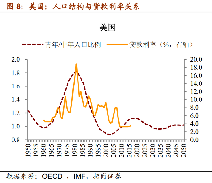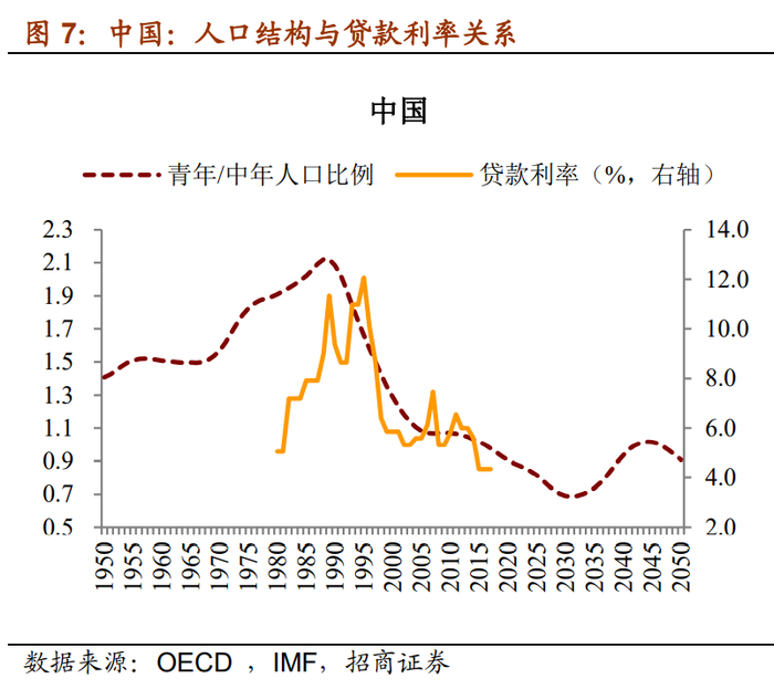 进一步检验,上述正相关关系在中国也成立。由于中国国债数据时间序列较短,我们以贷款利率作为利率的替代指标。结果表明,中国的青年/中年人口比例与贷款利率的走势也基本一致,而且人口结构拐点也恰好匹配贷款利率的长周期拐点。