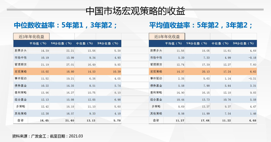 这是广发证券做过的一个统计。在中国的市场上,过去5年和3年,不同绝对收益基金策略收益率的排名,5年的平均收益,宏观策略排在第二位,一共有10个对冲基金的策略,宏观策略是排第二位的。看三年收益,宏观策略也是排在第二位。同样表现比较好的,还有就是刚才陈总介绍的CTA策略,也是一个绝对收益特征非常明显的策略。