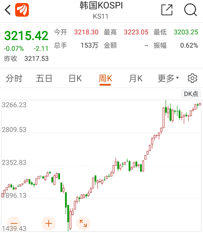 “禁空令”出台后,韩国股市上演“深V”反转,此后一路飙升,韩国综合指数不断刷新历史新高,最新收盘价较2020年3月的最低点累计大涨123.38%,成为全球最牛股市之一。