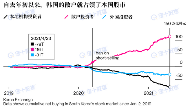 而一路走牛且没有做空机构的韩国股市,却吸引了大量散户投资者。据数据显示,2020年3月至12月期间,韩国个人投资者在股市净买入价值约38.1万亿韩元股票(约合人民币2207亿元),远超外国投资者(净买入21.5万亿韩元),机构则净卖出8.2万亿韩元。其中,很多韩国年轻人甚至不惜举债炒股,给韩国金融市场造成不少隐患。