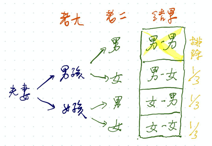 如上图:因为一旦指定了老大是女孩,上面的四种可能性中,要把“男-男”和“男-女”两个可能从样本空间中去掉,这样只剩下“女-男”和“女-女”,所以“女-女”的概率是50%。