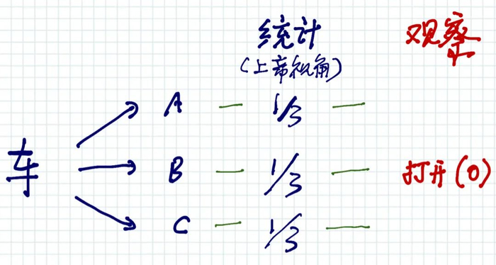 主持人打开B门,门后面没有汽车,理论上这是一个观察动作,带来了更多信息,理论上会改变概率,是吗?