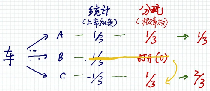 他主动选择了关掉B门后面1/3有车可能性的平行世界,并将其概率赋予给了C门,使其概率由1/3增加到了2/3。