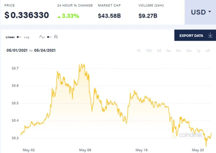 狗狗币同样重挫,从5月8日0.73美元至今,大跌了55%。