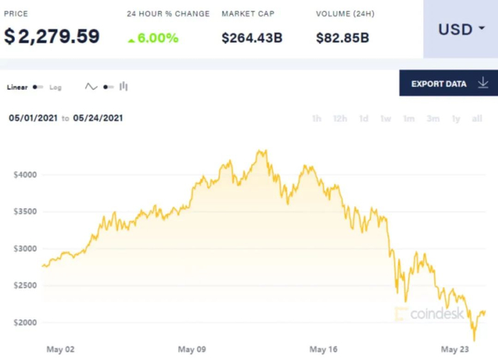除了比特币,以太坊也没有错过每一轮的跳水。5月12号还创下4300美元新高,目前已经只回落到2200美元;