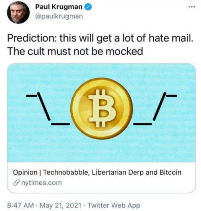 诺贝尔经济学奖得主保罗·克鲁格曼是最早的一批“比特黑”,早在2011年,保罗就以《金色的网络镣铐》为标题,在《纽约时报》上发表了点评比特币的文章。