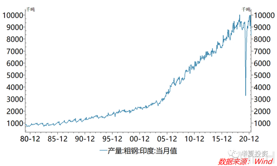 最近2年,印度的粗钢产量突破了1亿吨,并处于快速上升的趋势中。如果做一个对比的话,中国的粗钢产量突破1亿吨,是在2000年左右,基本也是中国城镇化加速的起点。