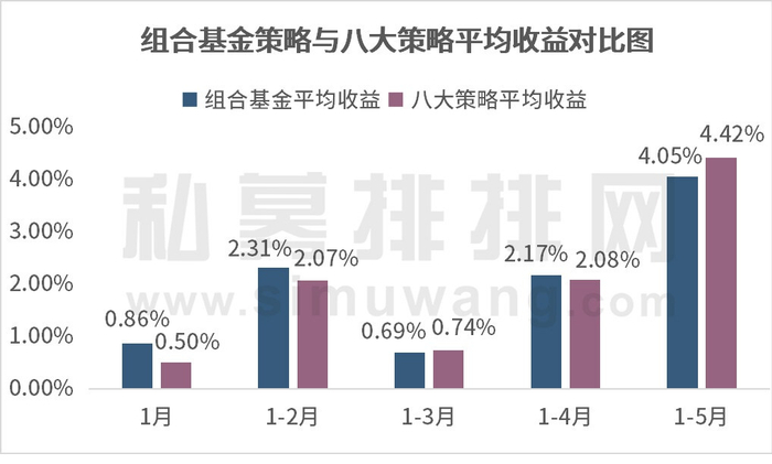 收益表现方面,根据1-5月的八大策略菁英榜数据,组合基金的平均收益录得4.05%。从各月的表现来看,通过多资产、多策略配置分散风险,组合基金策略整体显示出收益波动适中,平均收益与八大策略的平均收益水平较为接近的特点。