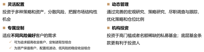 和裕投资认为,FOF的核心是资产配置和策略组合,是从产品设计到投后管理,为投资人提供全方位的资产管理和定制化服务。