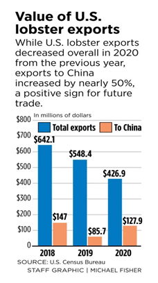 但是2020年美国龙虾对华出口却从上年的8570万美元增长到1.279亿美元,其中12月份对中国的销售额猛增至 3100 万美元。