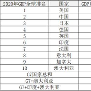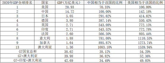 2:2020年中国经济总量是G7国家总和的38.12%, 是G7+澳大利亚总和的36.82%,是G7+澳大利亚+印度总和的34.49%。