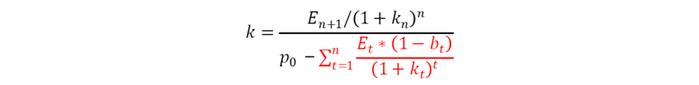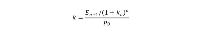 而这些假设并不现实,尤其是在市场的变化中,公司的新投资收益率与市场资金成本率k很难相等。所以现在我们放松第3个假设,也就是退回到公式4的估值模型,我们将其转换成收益率的形式,有了如下公式: