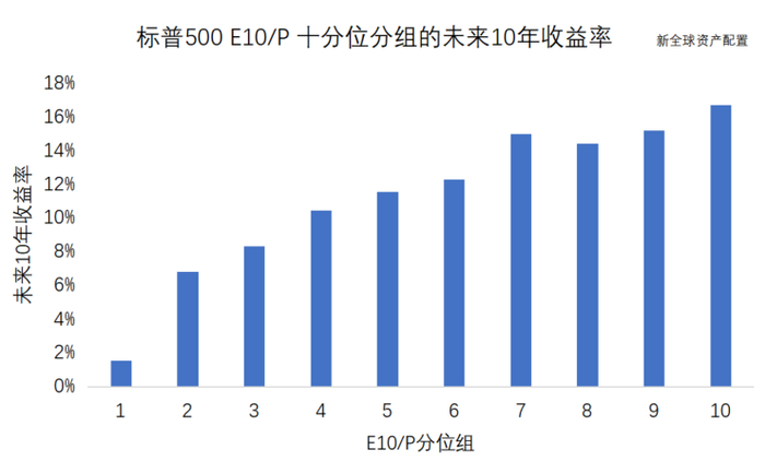 更进一步地,我们尝试分析E/P和E10/P这两估值指标,与未来实际收益的关系。下述两张图分别表示标普500指数的不同盈利收益率指标(E/P和E10/P)在10分位点分组下,分别对应的未来10年平均值实际年化收益率: