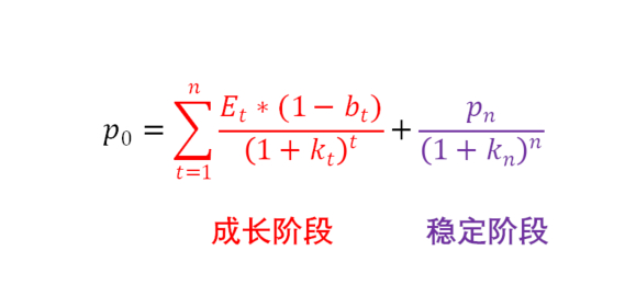 第二阶段,代表企业步入一个较为稳定的增长阶段,盈利增长较固定,该阶段的估值计算方式如上式紫色部分。