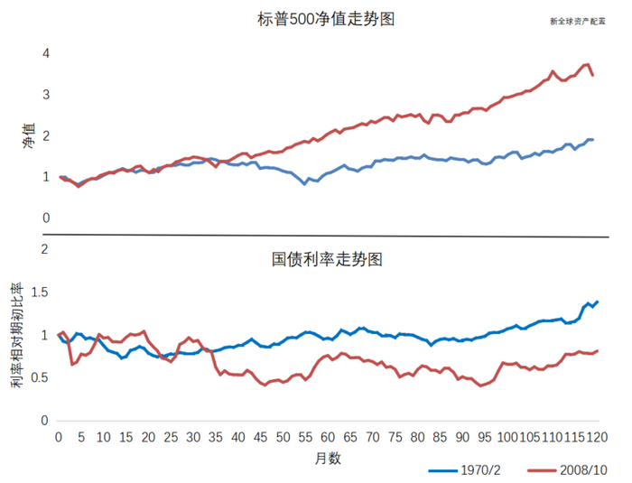 再来看下标普500指数净值走势图,在2008年后的10年时间里,美股迎来了一波牛市,期间净值走势明显高于1970年的后10年区间。而在这两个时间区间里,有一个明显不同的因素是:利率环境发生了大幅变化。