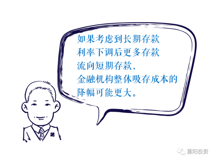 商业银行平均存款成本能够下降多少?根据媒体报道的某省优化后的方案,对于活期存款,四大行和其他机构的加点上限分别为10bp和20bp;对于3个月以上的各期限定期存款,四大行和其他机构的加点上限分别为50bp和75bp。对于1年以内的存款,优化后存款利率略有上调,但对于1年及以上的存款利率,则会大幅下调。根据中金公司的测算,静态的看调整后国有银行吸存综合成本将下降约7bp,其他机构的吸存综合成本将下降约2bp。如果考虑到长期存款利率下调后更多存款流向短期存款,金融机构整体吸存成本的降幅可能更大。