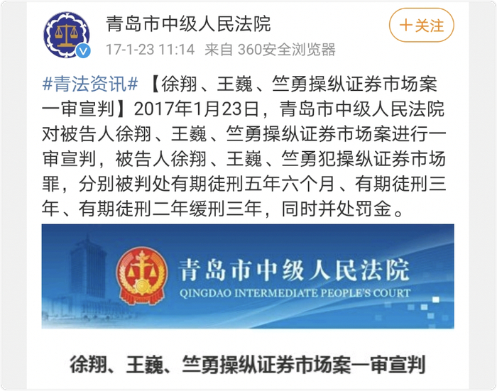 2017年1月23日,青岛市中级人民法院判处徐翔五年六个月有期徒刑并处罚金。这也成为中国证券市场首例信息型市场操纵案。