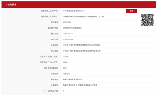 据了解,嘉创基金成立于2016年,2017年3月在协会备案,注册资本2000万元,实缴资本1000万元,管理规模区间为0-5亿元。业务类型为私募证券投资基金和私募证券投资类FOF基金,公司由杨婷、陈富坚、钟志权、谢小妹等4人共同出资,陈富坚为公司实控人、法人、执行董事。