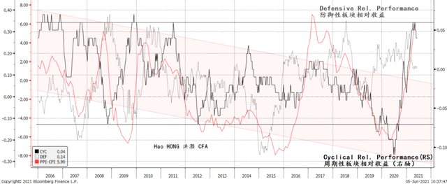 图表 3: 周期性板块的相对表现与 PPI 和 CPI 的差值从峰值开始同步回落