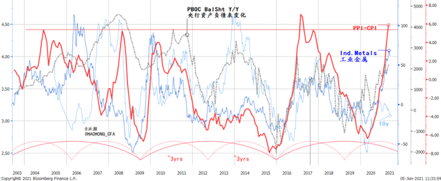 图表 1: 中国的 PPI-CPI 和央行资产负债表、十债收益率、人民币、恒指;一切看央行
