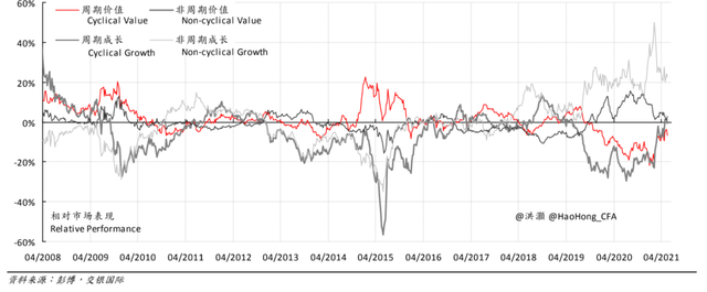 在展开对后市的讨论时,我认为有必要先理清概念。因为当前市场对于“周期和非周期”(周期和防御),“价值和成长”这两组概念存在误解。经常有人把周期看成价值,把非周期看成防御。