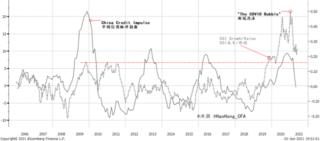 图4(上)是用中证的成长除以中证的价值而得,去年3月到去年11月份,成长板块表现出异常的收益率。同时伴随着国内信贷周期扩张,叠加上疫情隔离因素,产生了独特的市场环境,大家都坐在家里炒股票。成长板块大幅上升,远远跑赢价值板块。成长板块的相对收益达到了史无前例的高度。