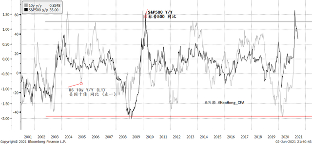 如图2所示,标普500的年化收益率与美国十年期国债收益率在触及历史峰值后已经开始下行。这预示着下半年,美联储将会有一个明显的避险动作,假如美国国债因为通胀进一步走高而上升,美联储加息的概率增大,美联储提前缩减公开市场操作规模。这一事件足以让连涨18个月的美股回调20%。美股波动,也会波及到A股。