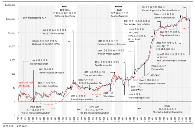 我们处在第4次工业革命中,每一次长波拉弓放箭的时候,也会伴随着整体社会科技水平的提高。由于科技水平的提高,人们收入生活水平的改善,使得整个终端需求持续上升。这个时候对于大宗商品的需求增大,让大宗商品的长波不断地往上走。这是以后的长期情况。